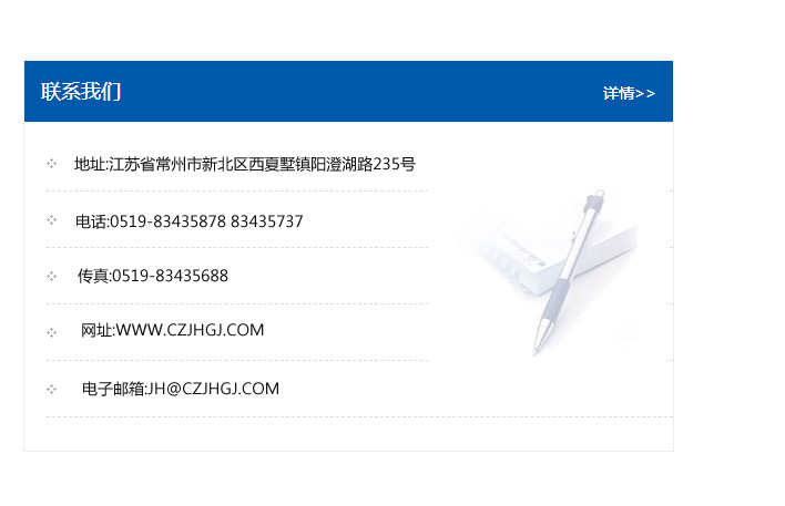 地址:常州市新北區友邦商務大廈1幢16、17層  電話:0519-85101652  傳真:0519-85112595  郵編:213022  網址:www.cz-jiayue_cn.wfweigengji.com  郵箱:xiajifengaa@163.com